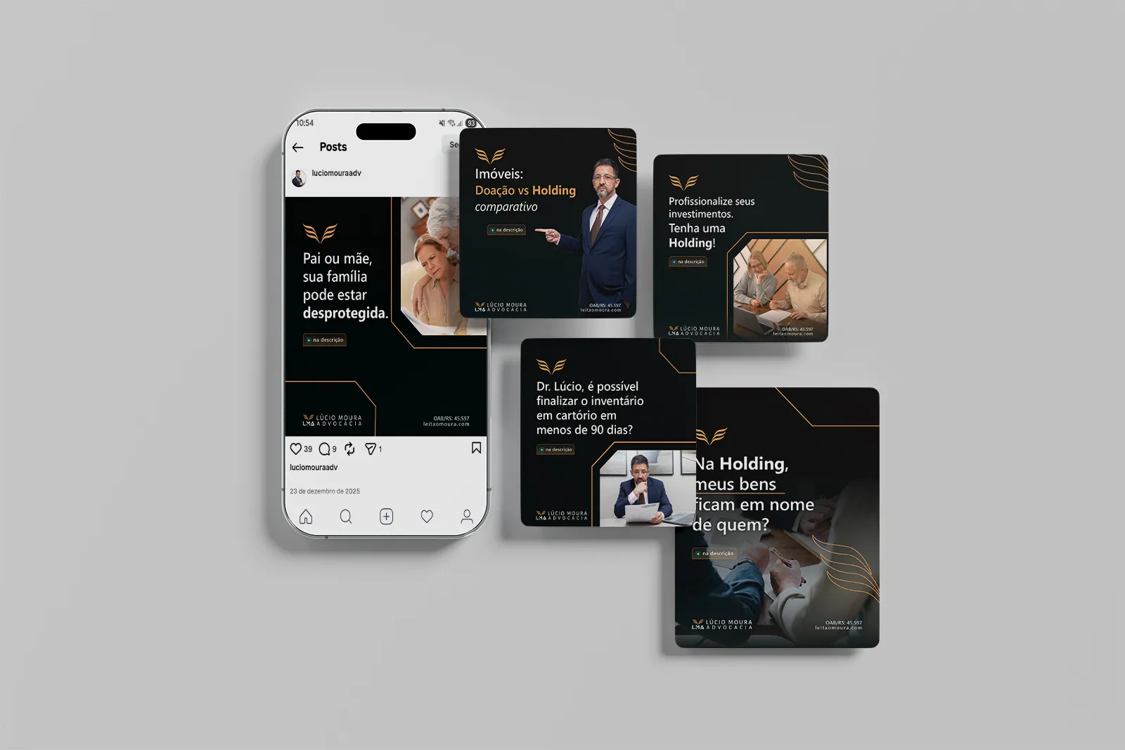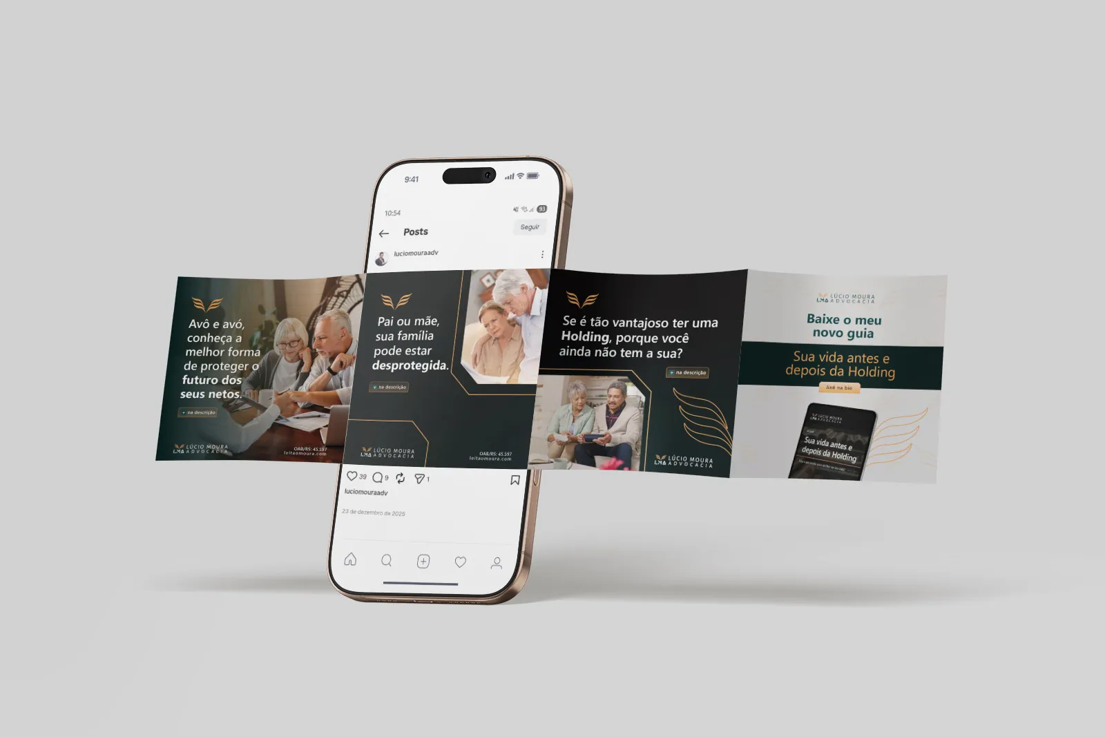 Desenvolvimento do branding aplicado às redes sociais, com criação de peças institucionais, conteúdos impulsionados e carrosséis informativos, mantendo coerência visual, linguagem clara e alinhamento ao posicionamento jurídico do escritório.
